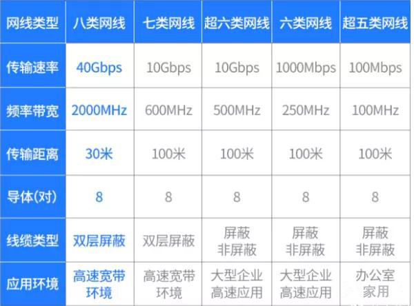八類線(CAT8):這里有必要提下八類網(wǎng)線,跟七類網(wǎng)線一樣的是雙層屏蔽(SFTP),它擁有兩個(gè)導(dǎo)線對(duì),2000MHz的超高寬屏,傳輸速率高達(dá)40Gb/s,但它最大傳輸距離僅有30m,故一般用于短距離數(shù)據(jù)中心的服務(wù)器、交換機(jī)、配線架以及其他設(shè)備的連接。雖然八類線傳輸距離短,但傳輸速率和頻率帶寬是遠(yuǎn)遠(yuǎn)超過(guò)其他類的。