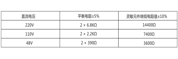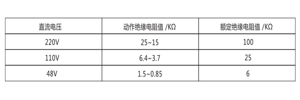 繼電器動(dòng)作值:當(dāng)母線任何一側(cè)對(duì)地絕緣電阻下降到下表規(guī)定值時(shí),繼電器應(yīng)可靠動(dòng)作。